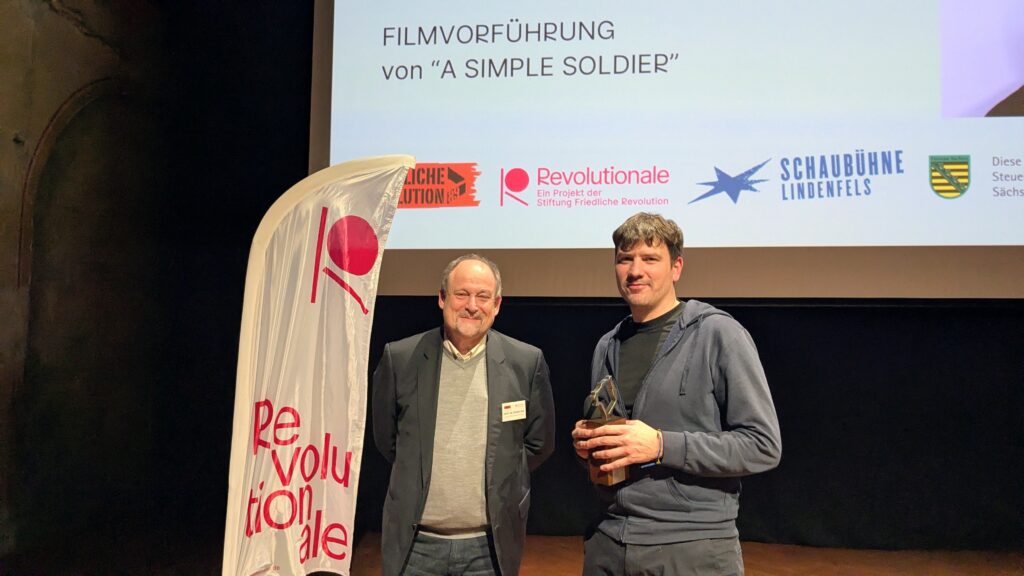 Im zweiten Teil der Veranstaltung wurde der DOK-Leipzig-Preisträgerfilm „A Simple Soldier“ gezeigt. Es erzählt die erschütternde Geschichte des Filmemachers Artem Ryzhykov, der im russischen Angriffskrieg auf die Ukraine zum Soldaten an vorderster Front wurde. Für seine direkte und intensive dokumentarische Zeugenschaft wurde die Dokumentation mit dem Filmpreis „Leipziger Ring“ der Stiftung Friedliche Revolution ausgezeichnet. Stellvertretend für Artem Ryzhykov und Juan Camilo Cruz nahm Tim Bohse den Filmpreis zur persönlichen Übergabe in der Ukraine durch Vorstandsvorsitzenden der Stiftung Prof. Dr. Rainer Vor entgegen.