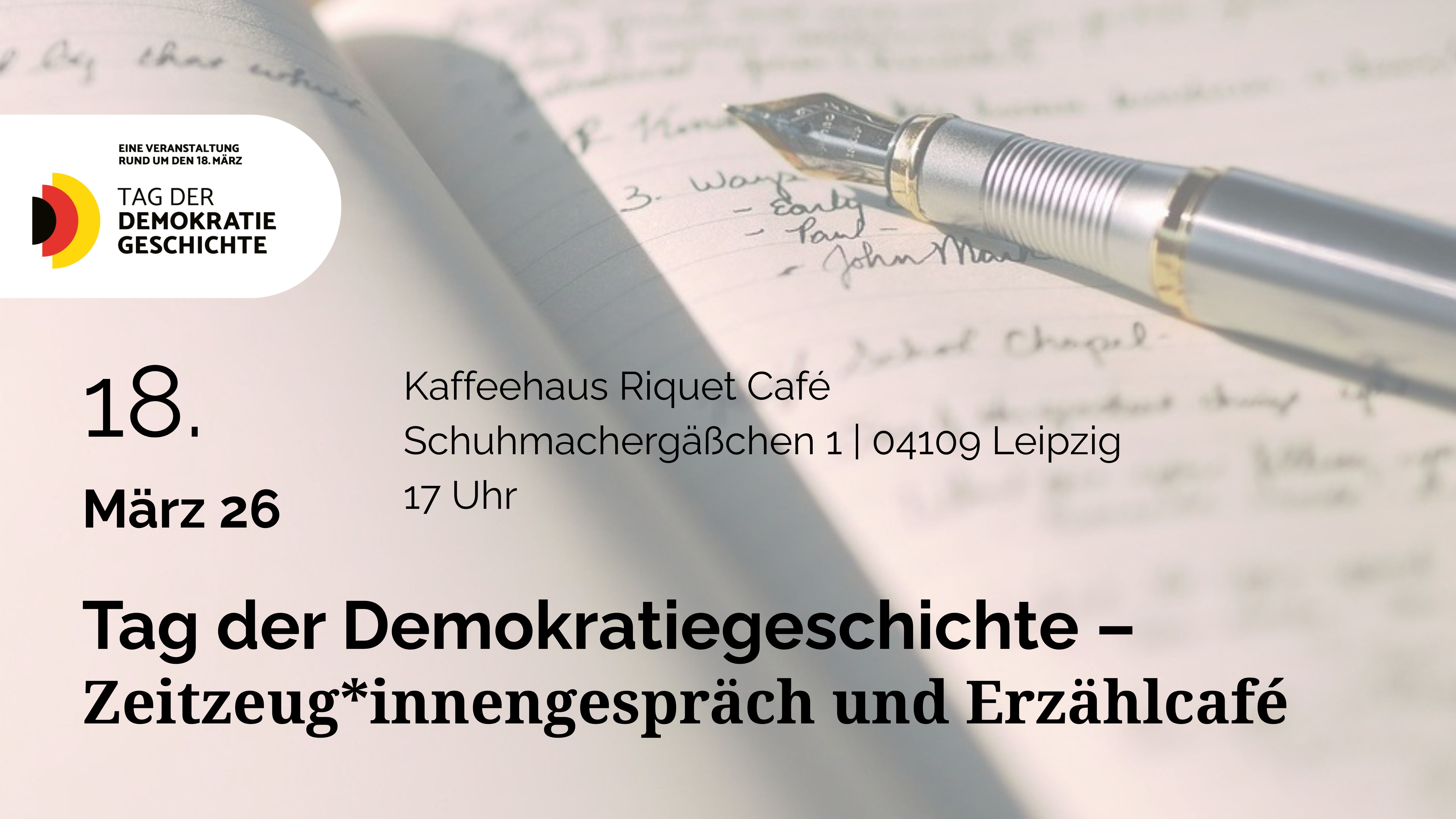 Historische Ereignisse sind mehr als Daten und Fakten – sie sind untrennbar mit persönlichen Erinnerungen und individuellen Lebensgeschichten verbunden. Anlässlich des Tages der Demokratiegeschichte laden wir Sie herzlich zu einer besonderen Veranstaltung ins Café Riquet ein, ganz in der Nähe eines zentralen Ortes der Friedlichen Revolution in Leipzig.